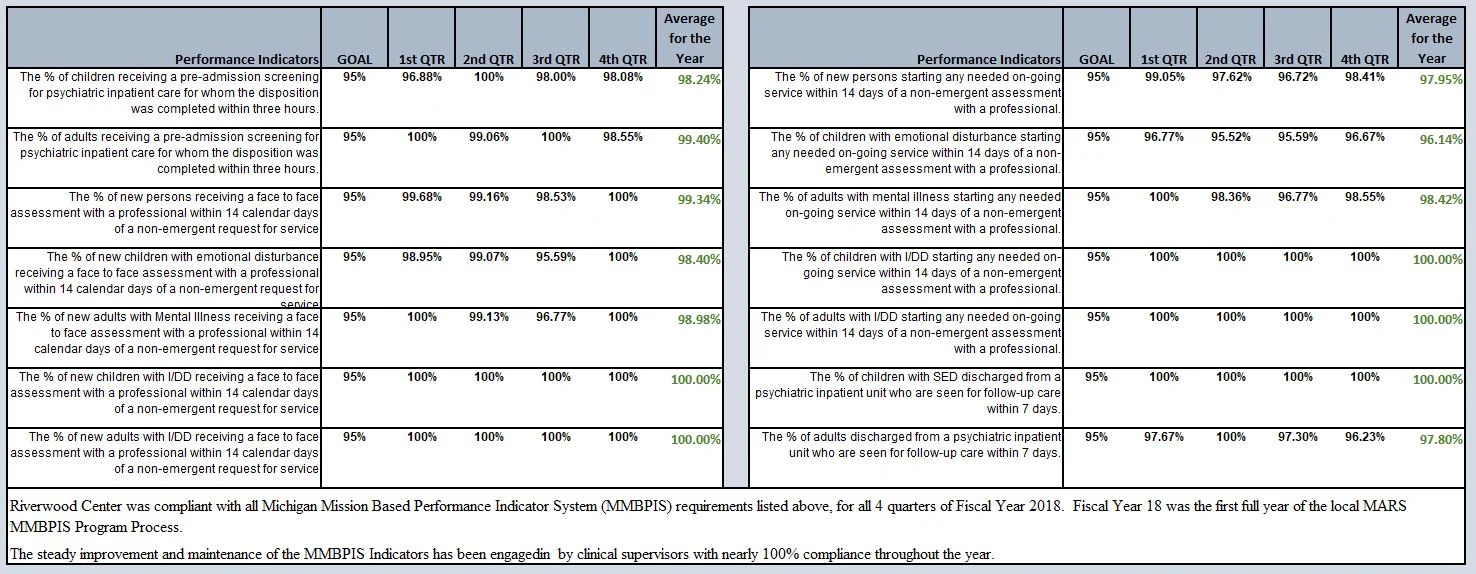 The State of Michigan uses the Michigan Mission Based Performance Indicator System (MMBPIS) to measure and hold accountable the Community Health Agencies’ effectiveness in providing timely, high quality treatment. This data is calculated based off of specific algorithms per state requirements. Each month, staff monitor and identify trends within the indicators to find outliers. Outliers are those data points that do not meet the state requirement for a specific indicator. Community Mental Health Service Providers (CMHSPs) are responsible for 6 indicators, from timeliness to treatment, to how many consumers are readmitted to inpatient facilities after discharge from services. The results of these indicators are reported to the state on a quarterly basis as shown below.